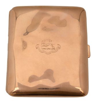 A George V 9ct gold cigarette caseBirmingham, 1921, makers mark R.Cof plain square curved form, engraved wiht a crest and motto "Conqequitur Quod Cunque Petit'8.7 x 7.2 cm., weight approx. 79.3g