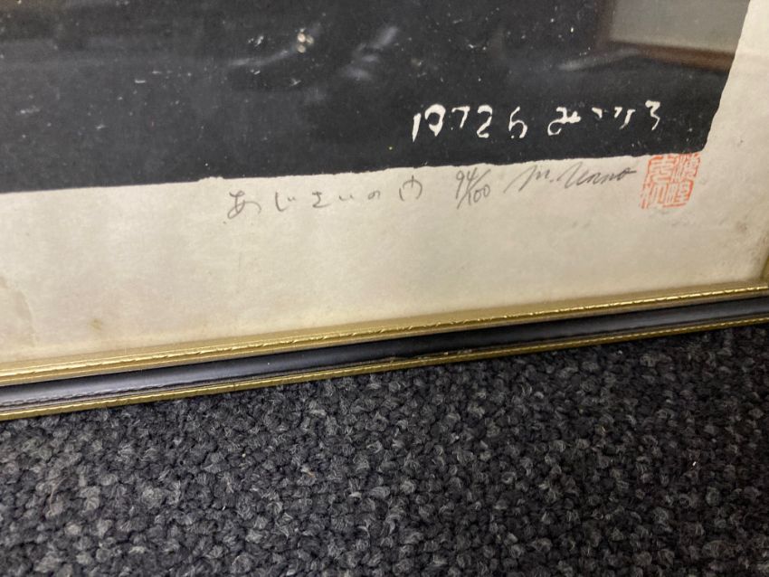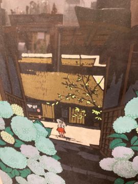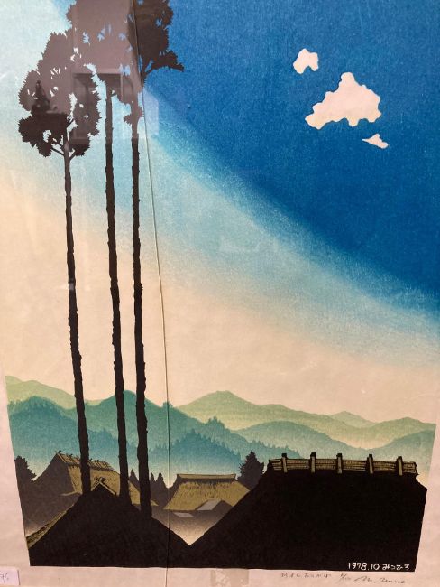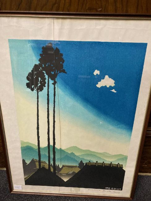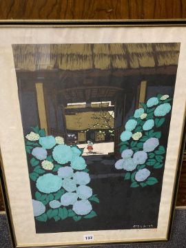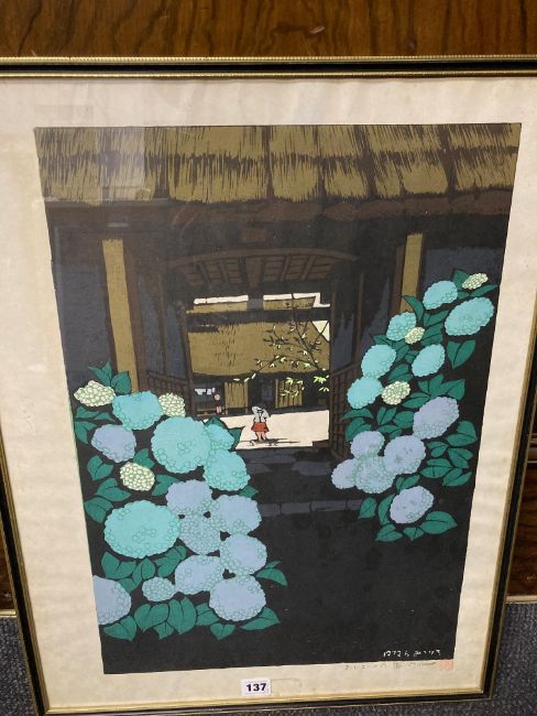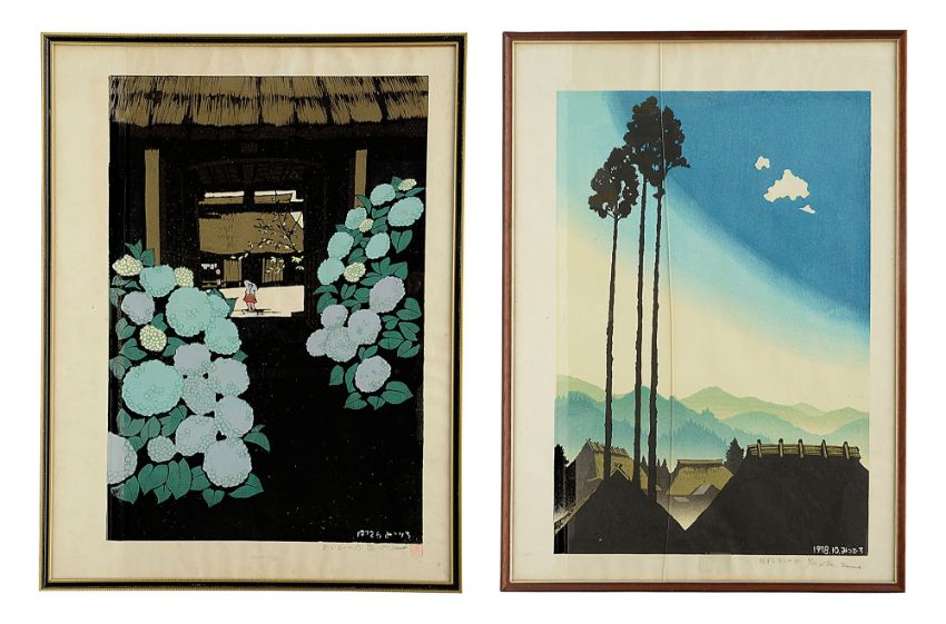Unno Mitsuhiro (Japanese, 1939-1979)Hydrangea Gate' signed, numbered 94/100 and titled in pencil, red seal stamp, dated within woodblock 1972, and 'Sugimoto Twilight", signed numbered 6/100 and titled in pencil, dated 1978 within woodblock, framed, (2)Each 64.5cm x 48cm.