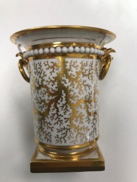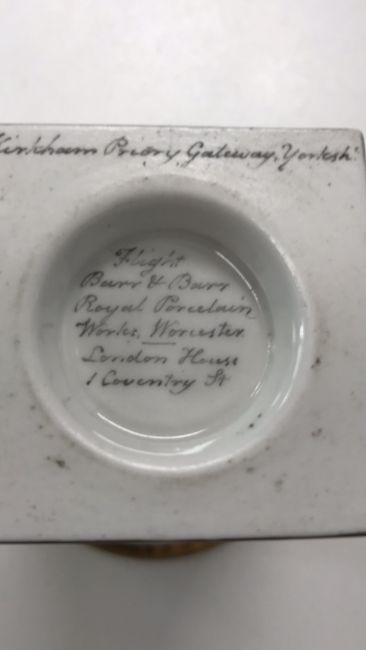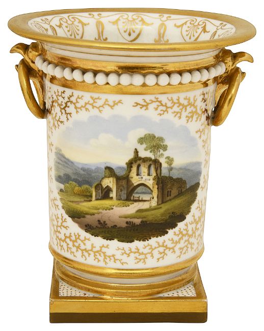 A Flight Barr & Barr Worcester topographical spill vase c.1810of cylinder form with twin fixed ring handles and beaded border, painted with a view of 'Kirkham Priory Gateway, Yorkshire, on a gilt seaweed ground, on a square base, titled and signed Flight Barr & Barr Royal Porcelain Works Worcester London House 1 Coventry St.