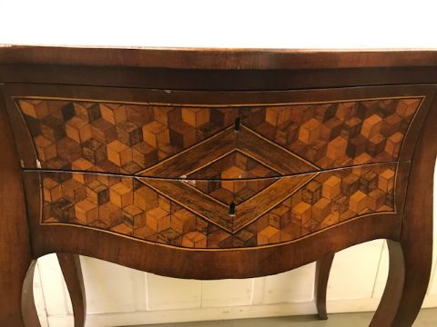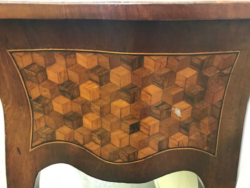 A 19th century Northern Italian parquetry side tabledecorated with rolling cube marquetry, banded and inlaid with stringing, of serpentine outline and with two drawers and cabriole legsHeight 78cm, width 74cm, depth 44.5cmCondition: There is a split to the mahogany banding on the top, left side. Minor veneer losses to the drawers and to the right hand side.This lot must  be collected from the Auction venue by 1pm Friday 10th February.  Please arrange transport before this deadline.   Uncollected property will be transported to our offsite storage facility and collection can be arranged by appointment only.  Additional fees of £20 apply for the transport