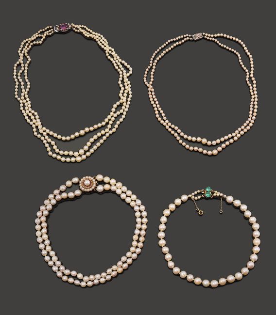 Five cultured pearl necklaces:the first a gradated three row to the silver cluster clasp; the second a graduated two row to the 9ct white gold tablet clasp with diamond detail; the third a two row slightly baroque to the 9ct yellow gold  ruby and cultured pearl cluster clasp;  the fourth a single baroque row to the two green stone clasp, the fifth a graduated single row to the white gold blue stone clasp, stamped 9ct (5)minimum lengths respectively 50cm, 49cm, 42cm, 39cm, 48.5cm combined weight 187.8gCondition:
