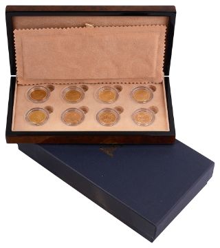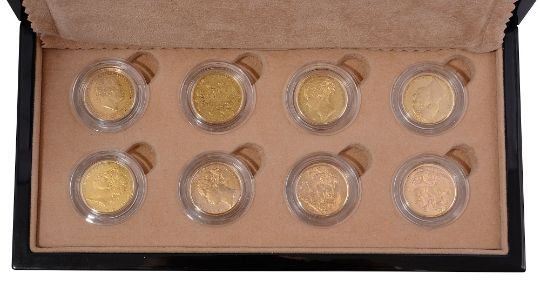 eight sovereigns tracing the history of the sovereign from George III to the reign of Queen Victoria including: George III 1820 facing right; George III 1821 facing left; George IV 1825 facing left; William IV 1832 facing right; Victoria 1852 facing left; Victoria 1871 facing left: Victoria 1891 facing left; Victoria facing left 1899, contained in faux walnut presentation case with original Royal Mint booklet and contained in outer card case
