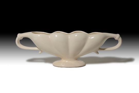 scallop shaped and with loop handles, underside with Fulham Pottery marks and stamped, 'FMC 3'