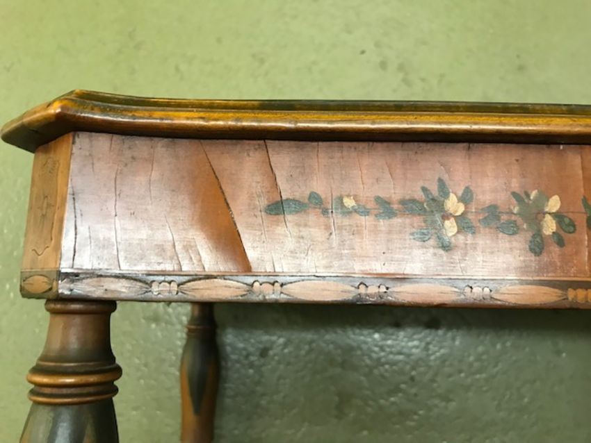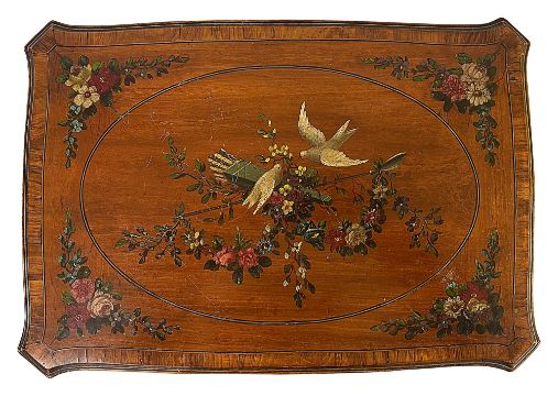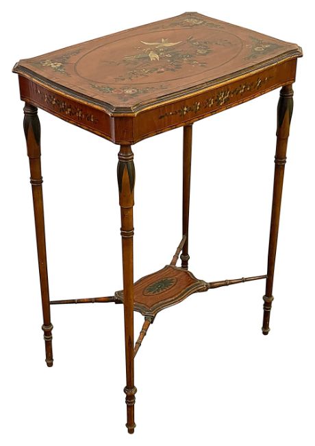 An Edwardian Sheraton Revival painted satinwood occasional tablethe kingwood banded canted top decorated with white doves on a quiver and arrow within rose garland corners, on turned tapered legs joined by an undertierheight 76cm, width 51cm, depth 36cmCondition:Some splits and cracks to the frieze veneers, which are dry, otherwise in tired houseworn condition.FURNITURE & LARGE ITEMS Must  be collected from the Auction venue by 1pm Friday 28th.  Please arrange transport before this deadline.   Uncollected property will be transported to our offsite storage facility and collection can be arranged by appoiment only.  Additional fees may apply