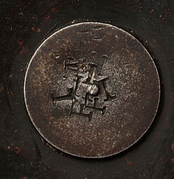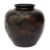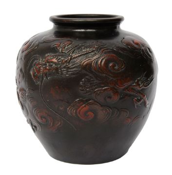 A Japanese Meiji Period  patinated bronze and cold painted vase of shouldered ovoid tapering form, cast in relief with a dragon and cloudheight 17.5cmCondition: Prieviously drilled for use as lamp and then later patched with a coin. Minor surface marks