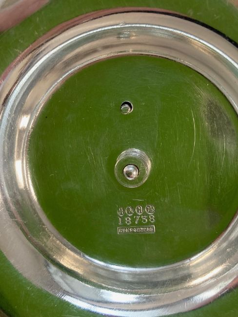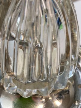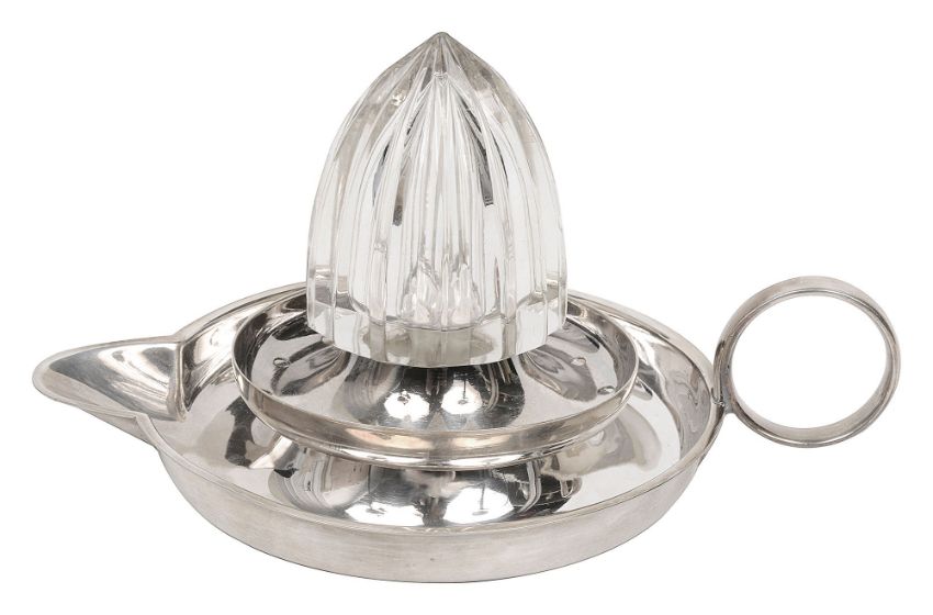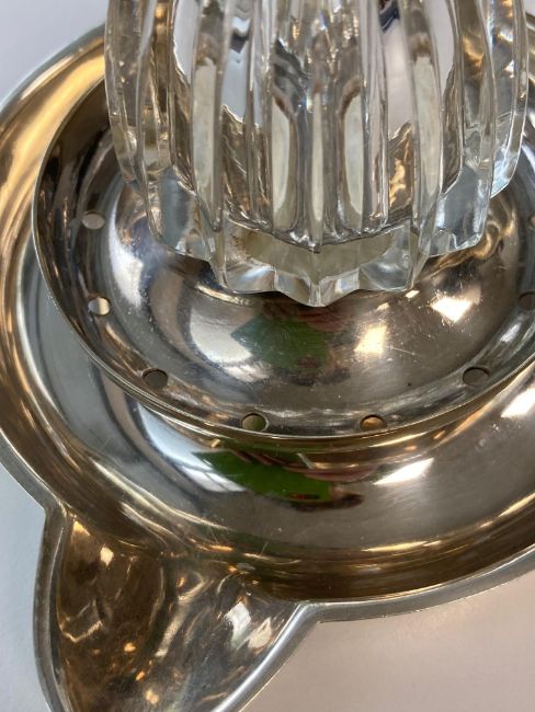 An Edwardian Hukin and Heath electroplated and crystal glass lemon squeezerstamped H&H and numbered 18738 RdNo493085length 18cm.Condition: Good condition. Slight imperfection in the glass from the moulding