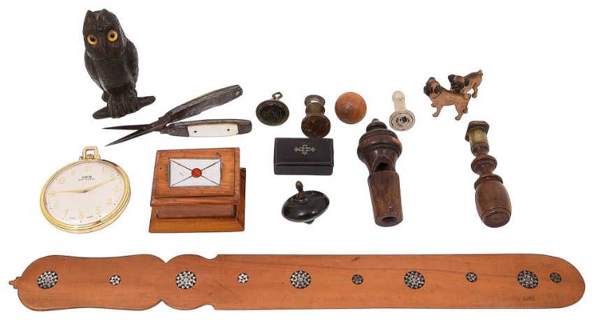 first naturalistically cast with glass eyes and hinged cover, the pugs in the manner Bergman with glass eyes, stamped indistinctly to underside, together with an olive wood stamp box mounted with an enamel envelope, treen whistle and spinning tops, an Indian sandalwood and sadeliwork page turner, fobs and desk seals, an Oris antishock gold plated slim pocket watch etc., (qty)