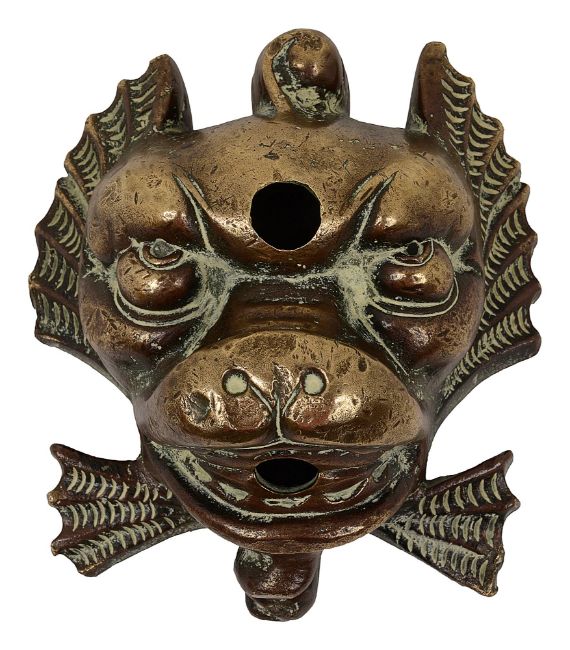An early 19th century cast bronze dolphin mask wall fountain water spout