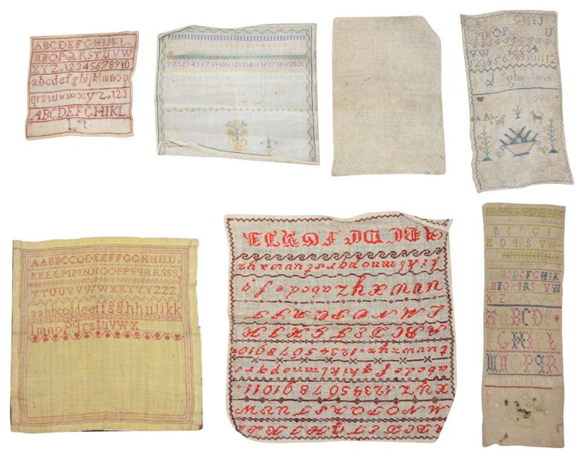 Seven 19th century embroidered alphabet samplers