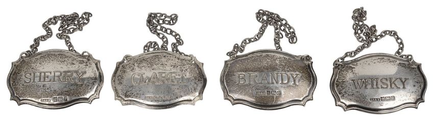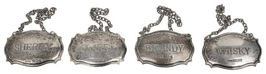 engraved 'Brandy', 'Claret', "Sherry' and 'Whisky', on chains, (4)