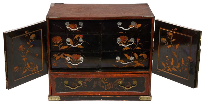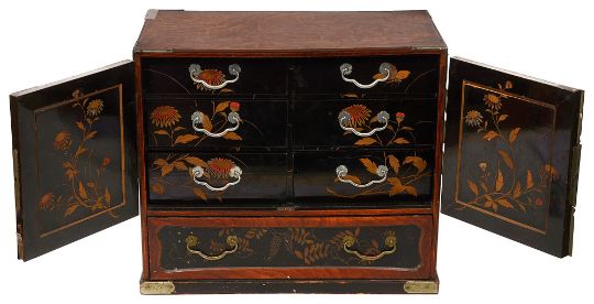A Japanese Meiji Period stained elm and lacquer table cabinet (Kodansu)