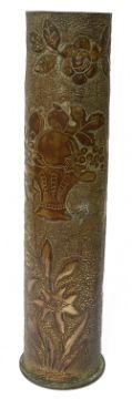 A large WW1 German Trench Art brass shell case vase repousse embossed with a bird with a letter in its beak, a fruit basket and flowers on a textured ground, signed Lecocq Delotte 1923, shell dated 1917 and stamped Karlsruhe Sp255height 50.2cmCondition:  Some tarnishing, but otherwise fine