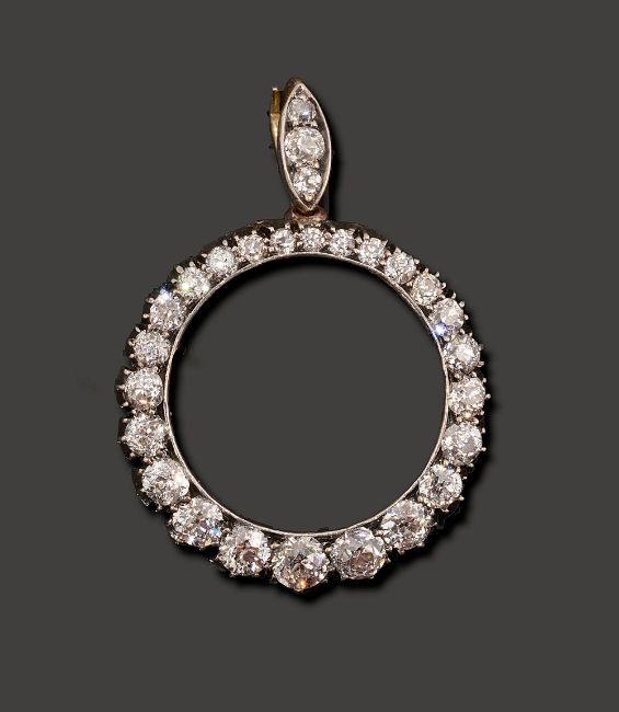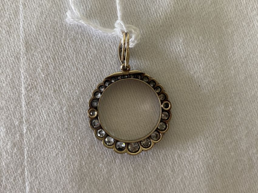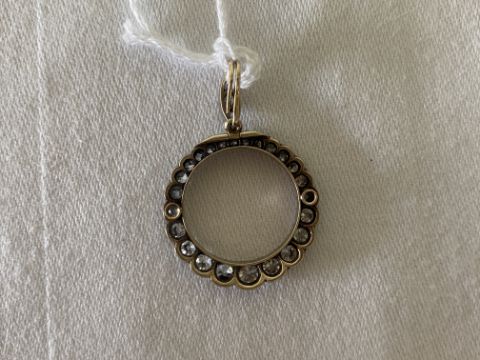 A diamond-set pendantof circular openwork design the border set with graduated old brilliant-cut diamonds to the articulated detachable old-cut diamond-set suspensory loop, mounted in silver and yellow goldouter diameter 2.5cm, length including loop 3.7cm, 4.7gCondition:  Lovely bright diamonds. Largest diamonds spreads 0.18cts, smallest 0.02ctsWell made. Probably converted from a late Victorian locket Brooch fitting deficient Largest diamonds spreads 0.18cts, smallest 0.02cts