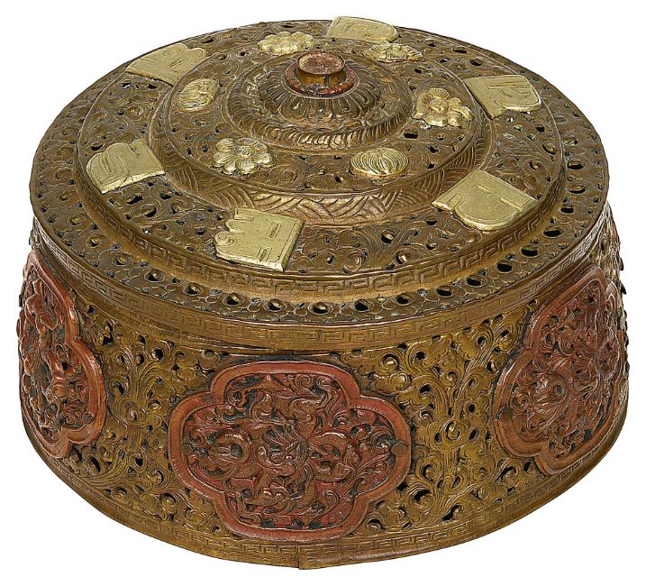 circular tapering form, all over pierced and embossed with scrolling clouds, the sides applied with reserves containing dragons, the stepped cover applied with white metal embossed flowerhead bosses and Tibetan characters,