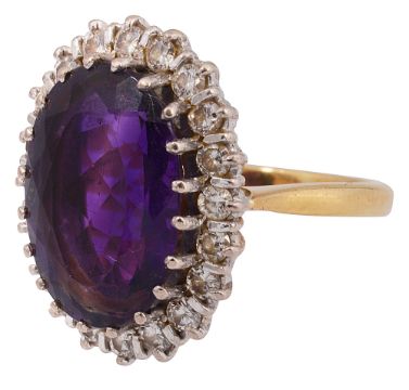 the oval mixed cut amethyst within a surround of brilliant-cut diamonds to the 18ct yellow and white gold basket setting and shank, London hallmark