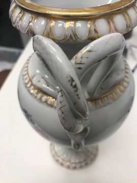 Condition:The gilt is rubbed overall, particularly to the snake handles. One snake has wear and glaze loss to its back, handle height, see image.
