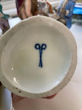 first the organist form the Monkey Band after J. J. Kandler, seated astride another monkey, incised 19 and numbered 107, underglaze blue cross swords mark with single slash mark, second a Meissen figure emblematic of Winter after J. J. Kandler,, incised C83, underglaze blue cross swords mark and two other Meissen style Monkey musicians , one playing the bag pipes, the other the French horn, underglaze blue scissor mark, (4)