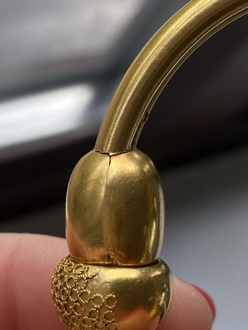A Victorian two coloured yellow gold twist torc bangle one terminal with the oak leaf cluster and acorn cup, the other with the acorn, oval bangle with inner ridgeinner diameter 5.6cm, weight approx 12.4gCondition: Overall condition fair commensurate with age.  Minor dings to bangle .  Several of the applied wirework circles on the acorn cup deficient -see photo.  Seams on each side  of acorn opening up and slight split where acorn joins bangle  hoop - see photo