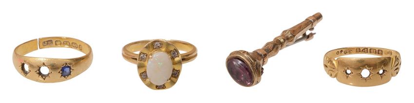A Victorian 18ct yellow gold gypsy ring, stamped with Birmingham hallmark, set with one sapphire, together with another 18ct gold gypsy ring (all stones deficient); a opal and diamond-set ring; and a fob bar brooch set with a foiled red stone