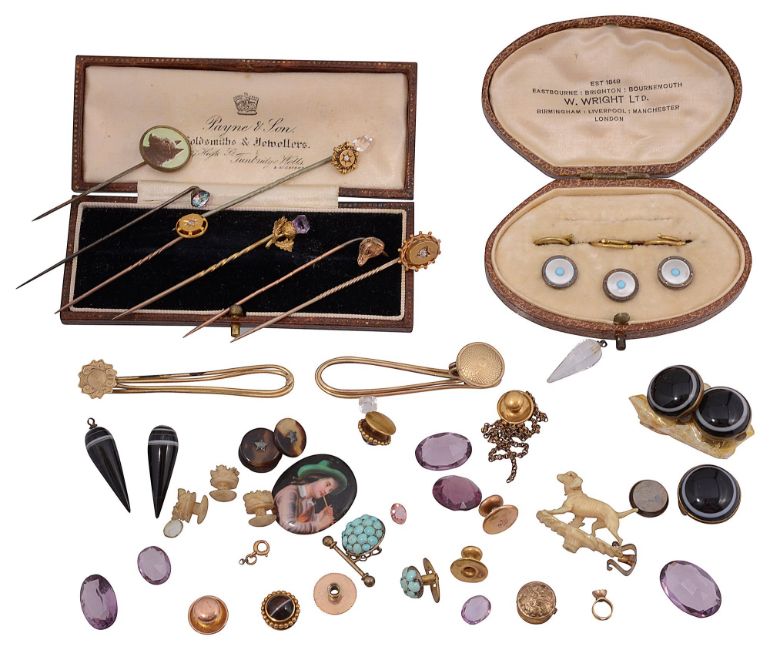 comprising a foxhead stick stamped 9ct, two diamond set stick pins with applied tag stamped 15ct, two banded agate studs, two studs stamped 18ct, a purple paste set thistle stick pin, unmarked, a carved antler hunting dog pin finial, three gilt and mother of pearl dress buttons in a fitted case, two pairs of banded agate cufflinks, two gilt napkin holders, a painted porcelain cameo, two banded agate drops, lose gemstones etc., (qty)