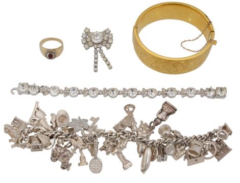 the first with silver charms and other charms variously marked with two separate charms, together with a 9ct gold ring marked ‘9ct’ set with colourless paste surrounding a red cabochon, 9ct metal core bangle marked with chased scrolling foliate design marked '1/5th 9ct', a colourless paste bow brooch and a colourless paste bracelet by Eisenberg Ice, marked to clasp 'Eisenberg Ice U.S. Pat Pend' (7)