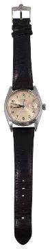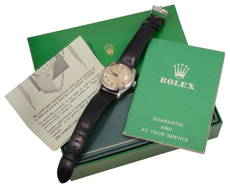 model number 1017, serial number 1747037, stainless steel case with leather Rolex strap, the silvered dial with, Arabic numerals, dot markers, date magnifier window, contained within original box and outer card box and paper guarantee purchased from Charles Packer and Company, Regent Street 1968, with outer paper postal cover