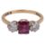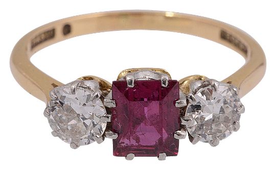 the central rectangular step-cut ruby set to either side with a brilliant-cut diamonds to the plain tapering shank stamped '18CT&PL'