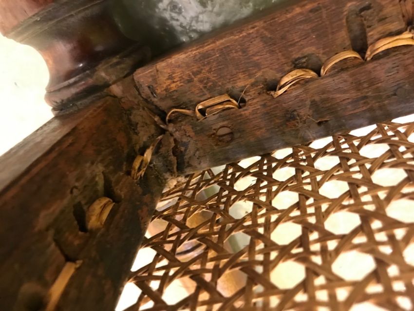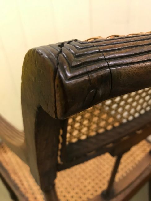 A Regency mahogany armchairearly 19th centurythe caned and satinwood panel back with reeded arms, on turned tapered front arm supports and legs, re-canedheight 82cm, width 53cmCondition:The top rail has screw supports to each corner. Old break to top of outer column support, some timber loss to this area. There is a crude screw repair to a seat rail at a corner. FURNITURE & LARGE ITEMS Must  be collected from the Auction venue by 1pm Friday 28th.  Please arrange transport before this deadline.   Uncollected property will be transported to our offsite storage facility and collection can be arranged by appoiment only.  Additional fees may apply