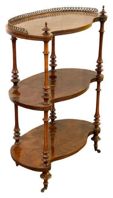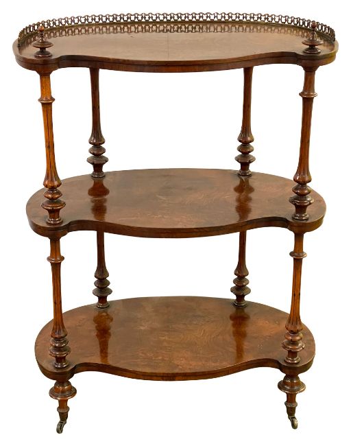 A Victorian figured walnut three tier etagereof kidney shaped form, the top with a pierced brass gallery and raised on turned tapered fluted supports, on short legs with brass cappings and castorsheight 102cm, width 73cm, depth 41cmCondition:The brass gallery needs fixing down at its right end near the front of the piece. In overall tired houseworn condition. FURNITURE & LARGE ITEMS Must  be collected from the Auction venue by 1pm Friday 28th.  Please arrange transport before this deadline.   Uncollected property will be transported to our offsite storage facility and collection can be arranged by appoiment only.  Additional fees may apply