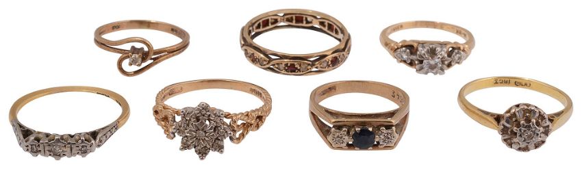 Seven assorted rings: five hallmarked 9ct, one stamped '14K and one '18ct', six with diamond-set detail