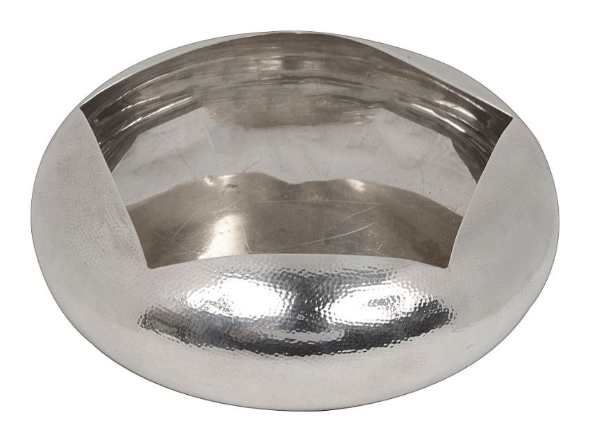 of compressed circular form with all over finely spot hammered decoration and shaped polygonal aperture, on a circular foot