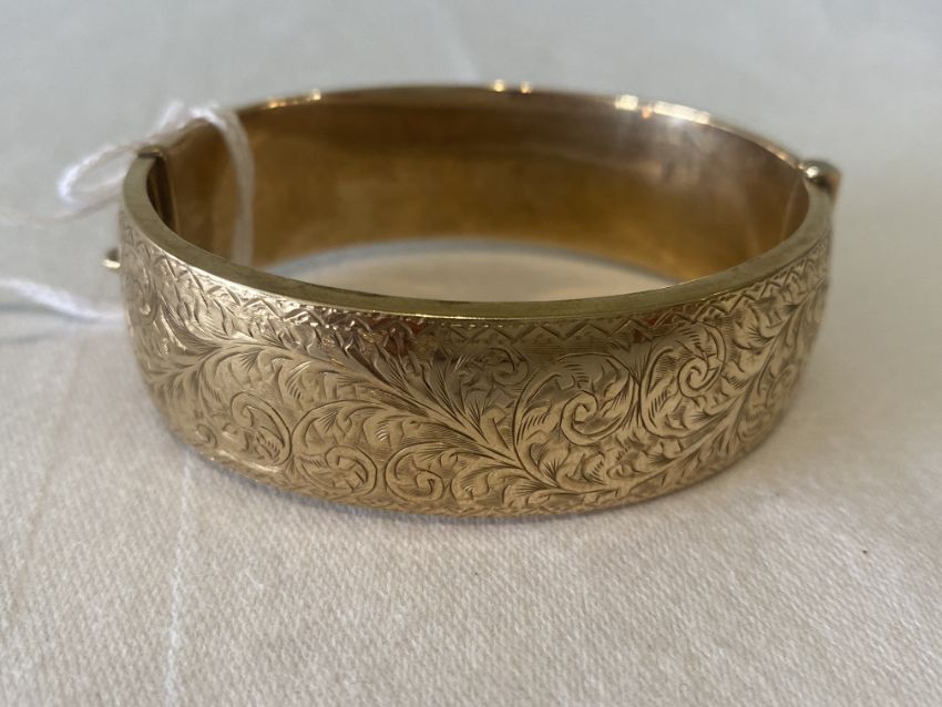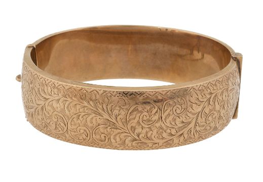 A 9ct gold hinged bangle marked ‘9.375’ engraved with scrolling foliate design to one half and safety chain total approx. weight 26g, approx diameter 6.5cm Condition:In good overall condition and clasp is in working order at the point of cataloguing. one very minute dent to centre of lower half (see photo).