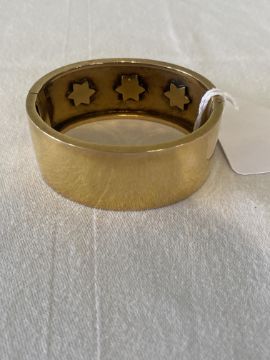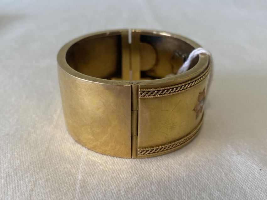 A Victorian yellow gold, coral and seed pearl hinged bangle the top section inlaid with three floral coral half bead and seed pearl flowerhead motifs to the border applied with rope twist and entrelac decorationmaximum inner diameter 5.5cm, 35.8gCondition:Coral well match with one half bead possibly a replacementLower half -  circular section in  middle is thinner Good click to clasp
