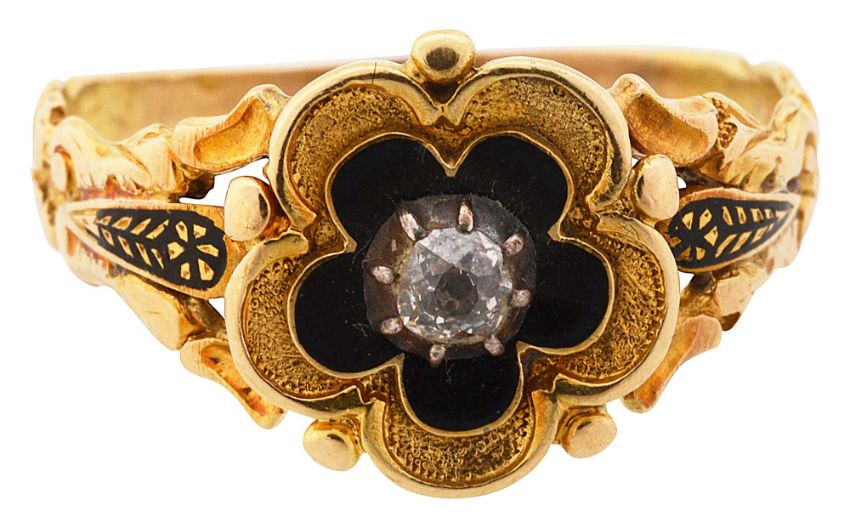 A late Georgian diamond, enamel and yellow gold memorial ring