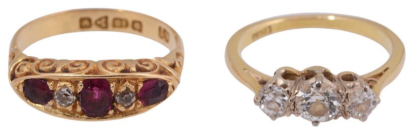 the graduated old brilliant-cut diamonds coronet-set to the tapering plain shank stamped '18ct' ; together with a ruby and diamond five stone ring within an 18ct yellow gold navette surround and shank, Chester hallmark 1907 (2)