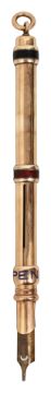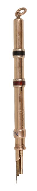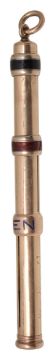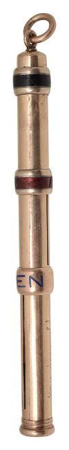 plain barrel with presentation inscription 'My dear old boy from h.K.', collar sliders one labelled 'Pencil' in blue enamel, the other two with red and black enamel hands, suspension ring terminal