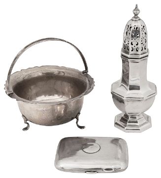 Condition:Overall fair condition to caster and sugar basin. The cigarette case with rubbed decoration