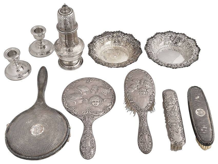 A small collection of silverto include a George V sugar castor, London, 1930, a Victorian pair of bon bon dishes, Sheffield 1897, a pair of Elizabeth II small candlesticks, Birmingham, 1971, a dressing mirror and brush, Birmingham, 1909, and a three piece dressing set, Birmingham, 1960, various makers, (10)height of castor 18cm, weighable silver approx. 12.61oztCondition:The mirror plate is detached from the 1909 dressing mirror.Some dents to the base edges of the candlesticks.