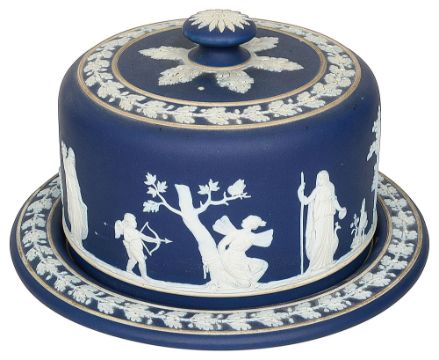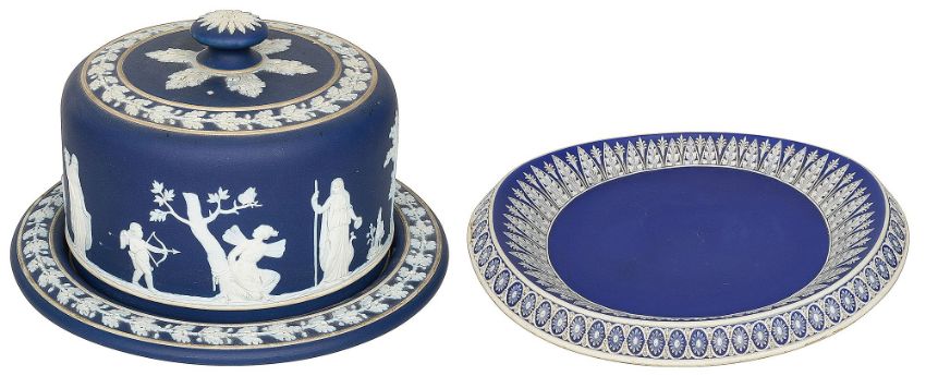 A Wedgwood blue jaserware cheese dome c.1900 and jasperware bread plate