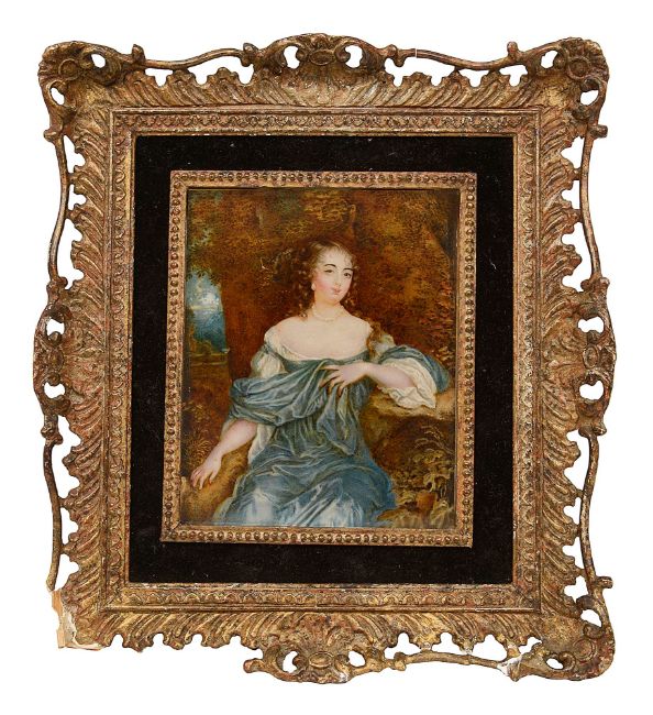 After Sir Peter Lely, (Dutch 1618-1680) A 19th century portrait miniature 'The Hon. Frances Brooke', watercolour on ivory, glazed gilt gesso frame inset with red velvet slip panel 13x 16cm., overall 28.5x 25.5cm.Condition:Slight bow to panel. bright and in good condition. Frame has been damaged and has losses IMPORTANT NOTEThis item has been registered as exempt from the UK Ivory Act 2018. Ivory declaration submission number reference: XZMXX6ZR