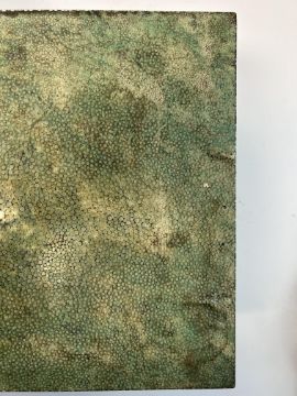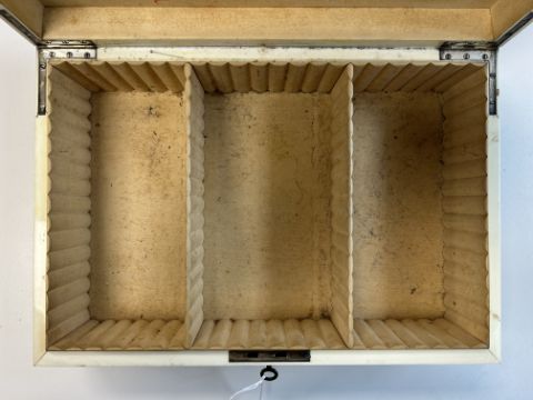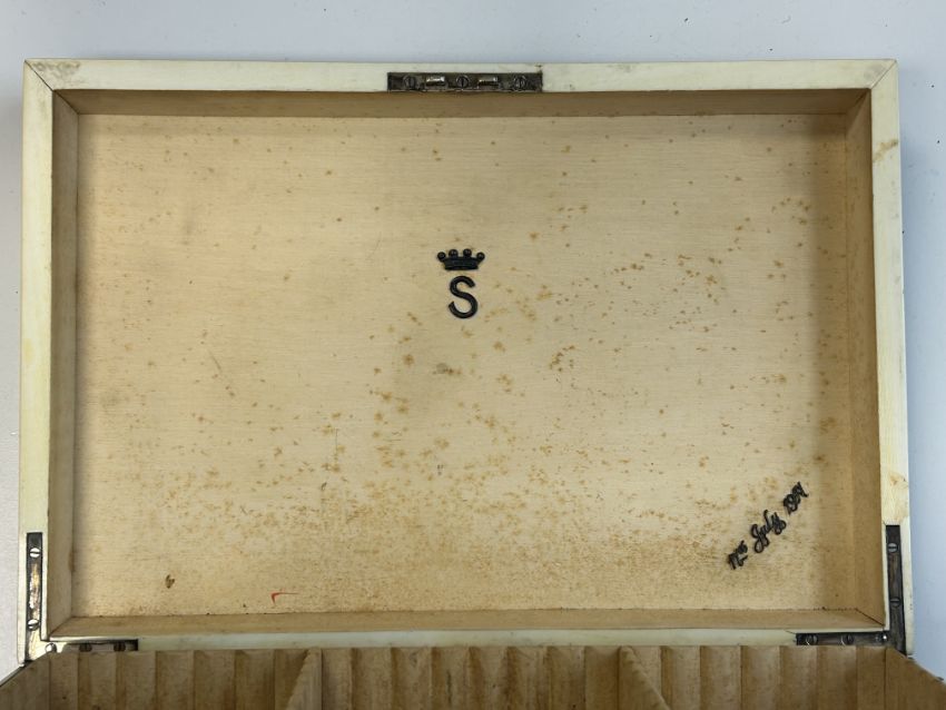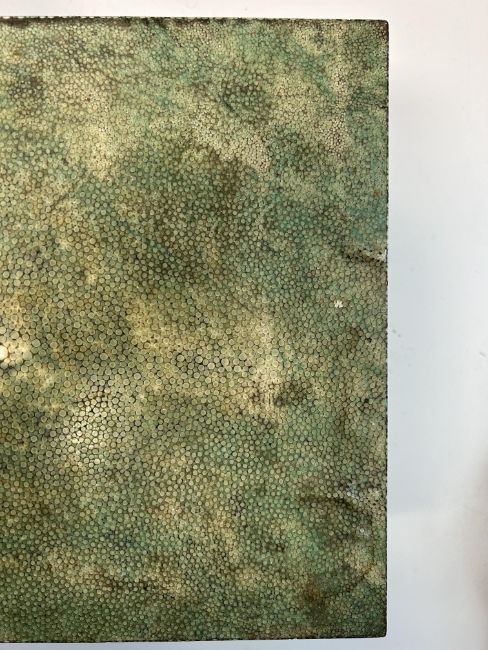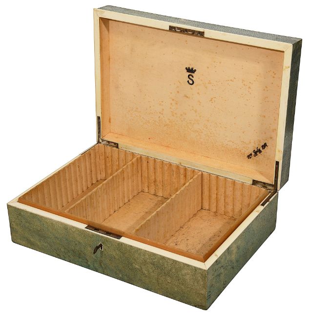 An early 20th century shagreen and ivory humidor by Callow interior maple lined with divisions, lid interior bearing an applied silver Barons coronet and the date 11th July 1917, silvered hinges and lock, with key, green grained morroco lined base inset with ivory label 'Callow Mount Street Park Lane height 12 cm., width 35.3cm., depth 24cm.Condition:Overall fair condition. Maple lined interior with damp spots / foxing and would benefit from a light clean. Key present but does not turn in the lock. Shagreen slightly lifting on the top right hand edge of the box IMPORTANT NOTEThis item has been registered as exempt from the UK Ivory Act 2018. Ivory declaration submission number reference: XFECKT32