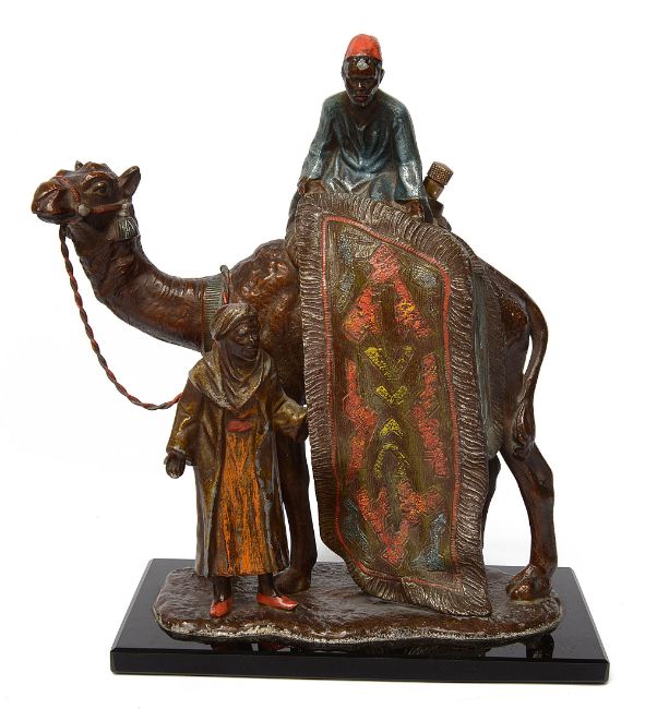 An Austrian cold painted spelter 'The Carpet Trader' table / cigar lighter in the manner of Bergmann  cast as an Arabian carpet trader mounted on camel back with an attendant, fitted with a striker, rectangular black glass baseheight 19.5cmCondition: Some wear and rubbing to painted decoration. Free from damage