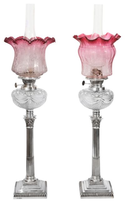 A pair of late Victorian silver and cut glass oil lampsboth London, 1897, Goldsmiths & Silversmiths Co., with glass chimneys and similar pink waisted shades etched with foliage, the silver plate Hinks and Son. burners above cut glass reservoirs and on stop fluted Corinthian columns on square stepped plinth bases with gadrooned borders, weighted, engraved to base edge '1872. Sep. 25th 1897', (2)Approx height from top of the capital of the columns 30cm, approx height including screwfitting and burner 49cm, approx height including shade not with chimney 59cm. Approx height of shade 15cm, approx height of bulbus shade 16cm. Condition:Some wear to the silvering at the edge of the burners. Good condition otherwise good.