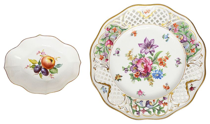 first relief moulded with matte and burnished gilt panels of flowers and rocaille, underglaze blue cross sword mark, incised Z 9, second with scalloped painted with fruit, underglaze blue cross swords marks, third