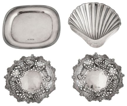 first Sheffield, 1909, Harrison Brothers & Howsom, on ball feet, second Sheffield, 1898, Mapin & Webb, of circular pierced design embossed with scrolls and with foliate rims, the stand Sheffield, 1925, Atkin Brothers, rectangular with raised border and reeded rim, on ball feet, (4)