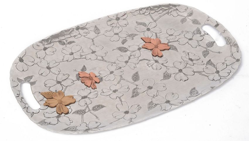 A Wendell August Forge twin handled mixed metal Dogwood tray rectangular curved aluminium tray decorated in relief with flowering branches and applied with three raised copper flowers, stamped factory markslength 44.7cm, width 29.2cm.Condition:  Good condition