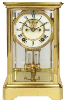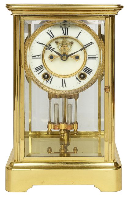 An early 20th century Ansonia lacquered brass four glass mantle clock