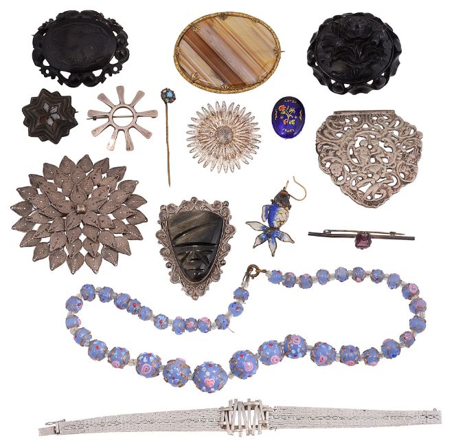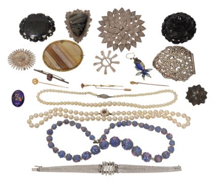 to include a 9ct gold flower stick pin, an Edwardian knot stick pin with applied tag stamped 15ct, another unmarked, a Victorian oval jet brooch carved in relief with flowers, another similar, a single strand cultured pearl necklace with garnet and pearl cluster push clasp stamped 9ct, another single strand graduated cultured pearl necklace with silver clasp, a gilt mounted oval banded agate brooch, a Mexican silver and carved black tiger eye Mayan mask pendant with brooch fitting signed TNC, a Scottish silver modernist daisy brooch a large Israeli silver filigree flower brooch, Murano graduated bead necklace, Chinese silver and enamel fish earring, (qty)