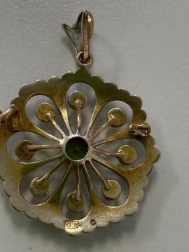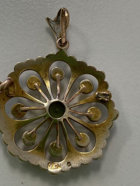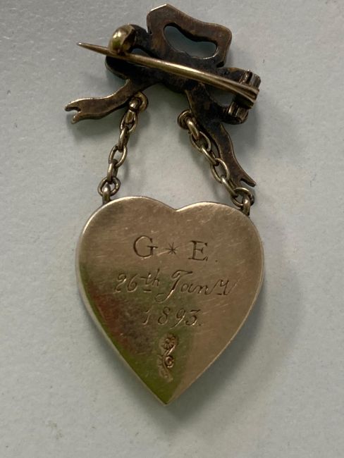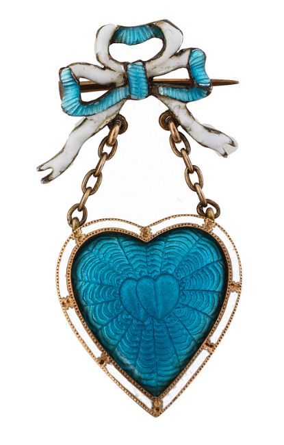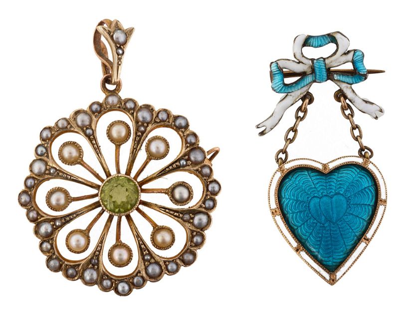 A late Victorian enamelled yellow gold pendant brooch by Child & Child, the heart-shaped pendant with a turquoise guillouché enamel centre to the white enamel border suspended from a similar bow, the reverse with presentational inscription for 1893 and with the impressed mark for Child and Child; together with an Edwardian peridot and seed pearl openwork pendant, the reverse stamped '9ct', (brooch fitting deficient)