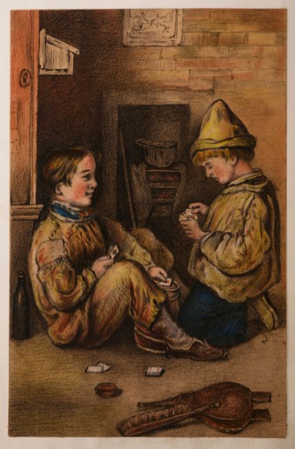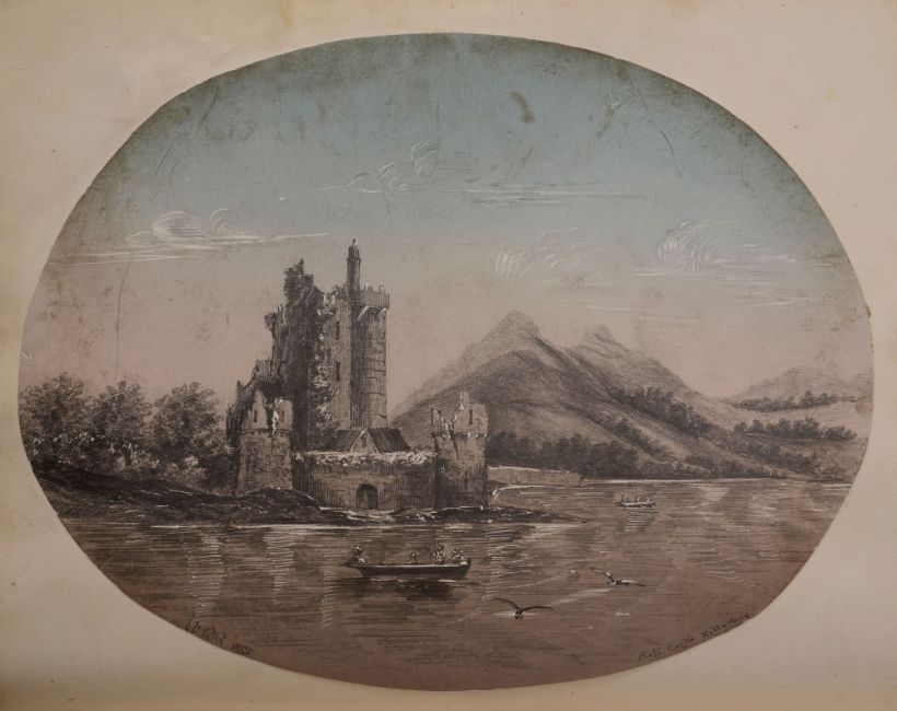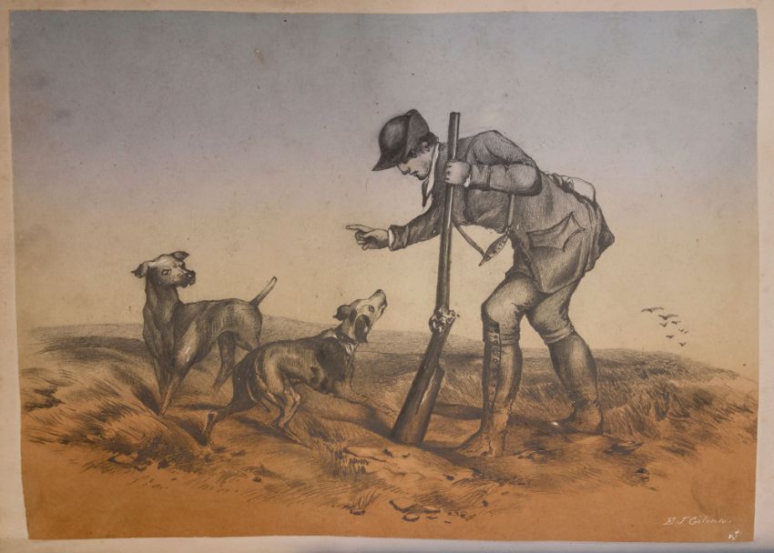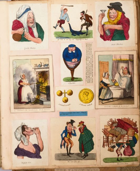 Four mid 19th century albums c.1855comprising an album of watercolours, drawings and verse to include a laid down study of a sportsman with two pointers signed E J. Gilmore, crayon study of two boys playing cards, pencil sketch of Ross castle Killarney, initialled WRR 1855, The Obelisk Newton Park, hand coloured lithographs, an album containing botanical watercolours, two watercolour and pencil studies of rustic figures signed G. Copeland, 1832, a view of a continental market square, a scrap album containing numerous laid hand coloured humorous prints, pencil and watercolour study of a fog springing wildfowl, a decoupage album with verse, loose prints, (4)Condition:album of watercolours and drawings lacking both boards and spine, album of prints lacking boards and spine some pages dog earedwith loses, some pages lose, contents mostly clean decoupage album all stuff down - some torn removed spottign and offsetting. no spine